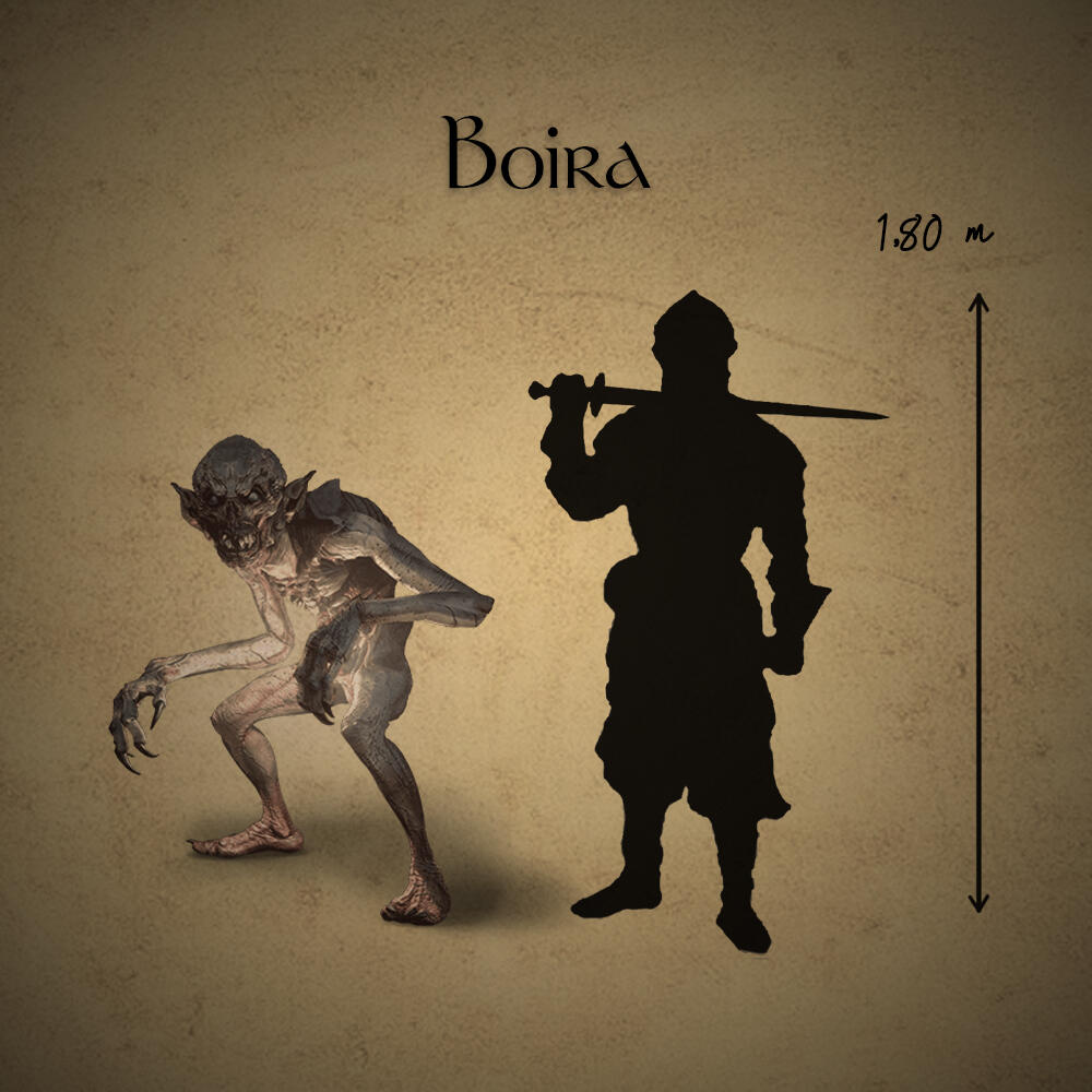 Una de las criaturas más peligrosas y astutas que un jinete puede llegar a cruzarse, los Boiras son cazadores consumados y extremadamente inteligentes. Utilizan su capacidad única de invocar una espesa niebla que desorienta, ensordece y ciega a sus víctimas para atacar con una fuerza arrolladora. Sus desproporcionadas manos poseen unas garras lo bastante afiladas para traspasar una cota de malla, por lo que deben extremarse las precauciones al enfrentarse a uno.Debilidades: la niebla que invocan es su gran baza, pues no son en absoluto ágiles ni rápidos. Despejarla debería cambiar las tornas a favor del jinete… si no ha sido antes empalado por sus potentes goles.
