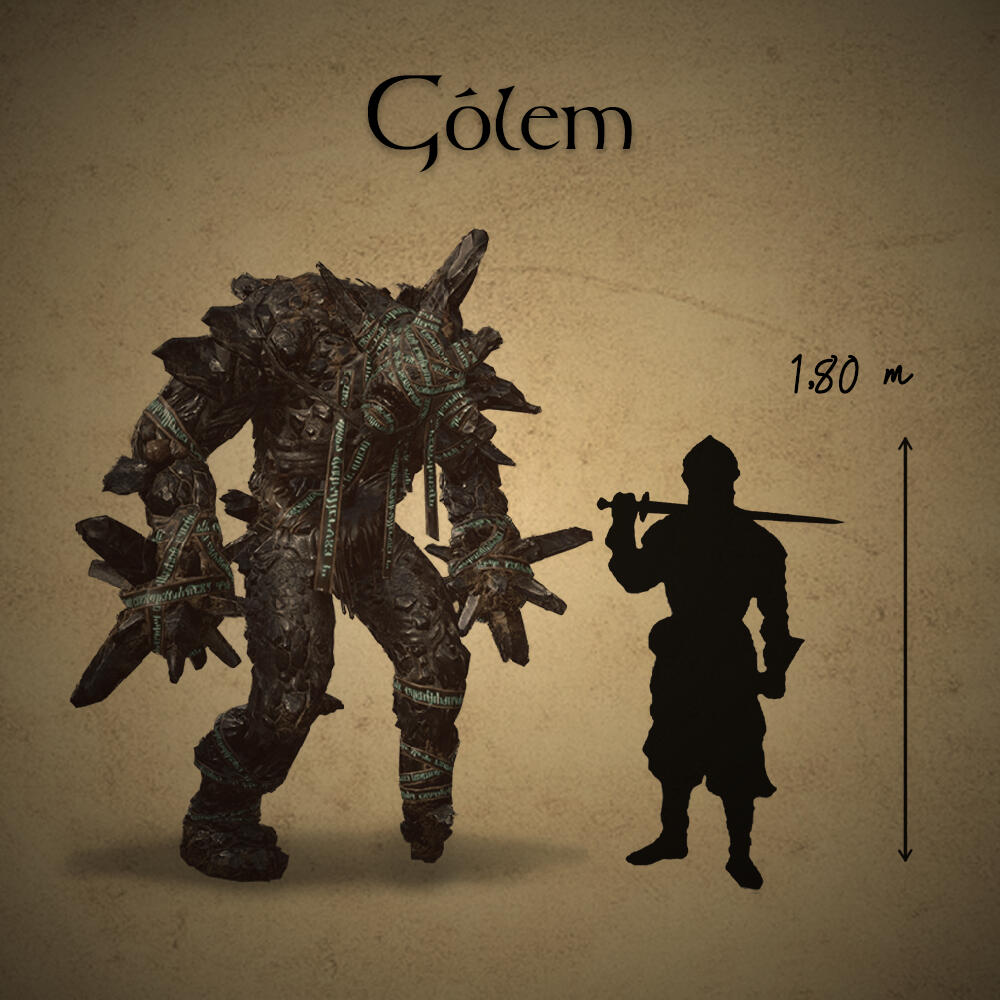 Los golems no son más que materia inerte con forma antropomórfica que ha cobrado vida gracias a un hechizo, comúnmente inscrito en la propia figura o dado por un objeto incrustado en la misma. Quién o qué las construyó sigue siendo un misterio a día de hoy, pues solo se los encuentra guardando templos o antiguas fortalezas, especialmente en la provincia de Tyrrendor. Pese a su tamaño y capacidad destructiva, no representan un peligro a menos que se las perturbe, por lo que no suelen causar problemas a la población general.Debilidades: prácticamente ninguna. No están vivos, por lo que no se cansan, no necesitan comer, dormir o conocen el dolor. La única forma de desactivarlos es quebrar el hechizo que los conforma… o emprender la ardua tarea de destruirlos por completo.