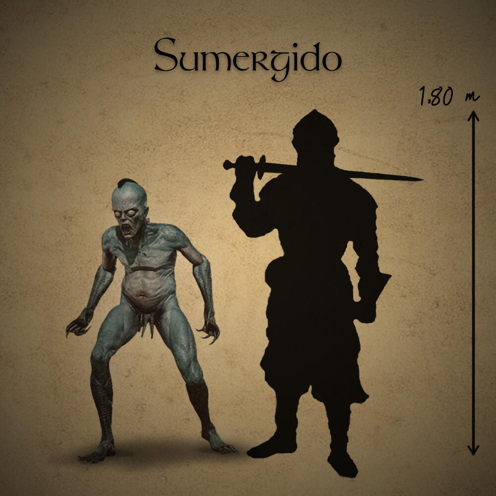 De aspecto semejante al de un cadáver que ha pasado demasiado tiempo en el agua, estos necrófagos oportunistas son la pesadilla de los pescadores navarros. Existe la creencia popular de que son los cuerpos reanimados de pobres incautos que se ahogan en lagos o se adentran demasiado en las ciénagas, pero nada más lejos de la realidad. Sus extremidades con dedos palmeados y las branquias en sus cuellos los convierten en excelentes nadadores, y aunque se alimentan casi exclusivamente de materia en descomposición, se les ha visto atacar en masa aldeas costeras en tiempos de hambruna.Debilidades: son huidizos por naturaleza, por lo que una demostración de fuerza suele ser suficiente para disuadir un ataque. Sus adaptaciones acuáticas los vuelven torpes en tierra firme.