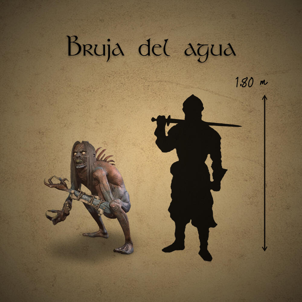 Es bastante probable que el cuento de la anciana que habita en el bosque y atrae a niños para devorarlos esté inspirado en una bruja del agua. Habitan principalmente en ciénagas y pantanos, donde su aspecto putrefacto combinado con el barro en el que se mueven las hace pasar desapercibidas ante sus presas, a las cuales dejan pudrirse antes de darse un festín con sus entrañas.Debilidades: confían en el elemento sorpresa en sus enfrentamientos, mas suelen huir si su oponente demuestra ser algo más que una presa fácil. Aún con ello, no se deben subestimar, pues son sorprendentemente ágiles para su tamaño, y sus garras pueden partir a un venado por la mitad.