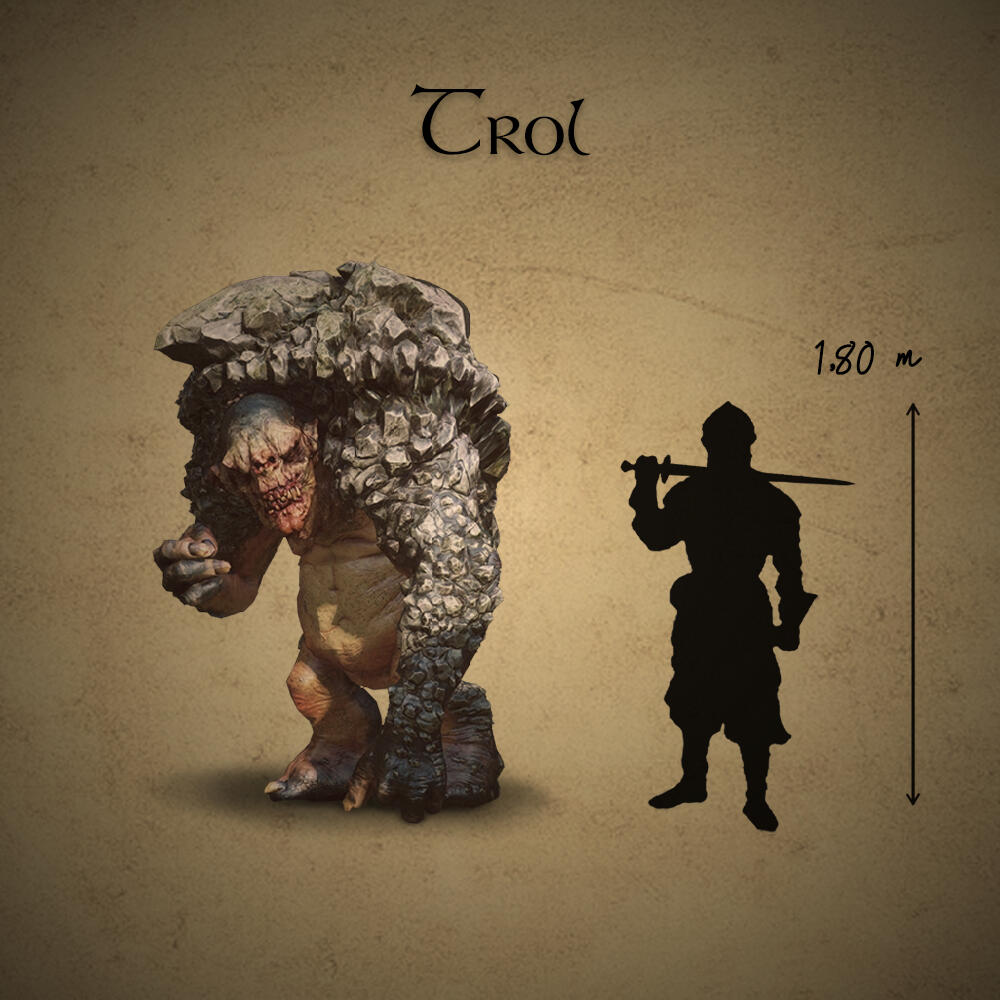 El único de la familia de los ogroides del que se tienen registros de interacciones pacíficas, los trolls son un caso curioso dentro de este bestiario. Son lo bastante inteligentes para aprender nuestro idioma —aunque no se debería esperar poder mantener una conversación fluida— y, aunque son territoriales, se puede razonar con ellos en caso de malentendido. De lo contrario, todo jinete debería recordar que su espalda y brazos están cubiertos de una capa de roca casi imposible de atravesar con el acero, y suelen defenderse lanzando grandes piedras a velocidades vertiginosas.Debilidades: tienden a caer en trampas fácilmente, y no son particularmente brillantes en el combate cuerpo a cuerpo.